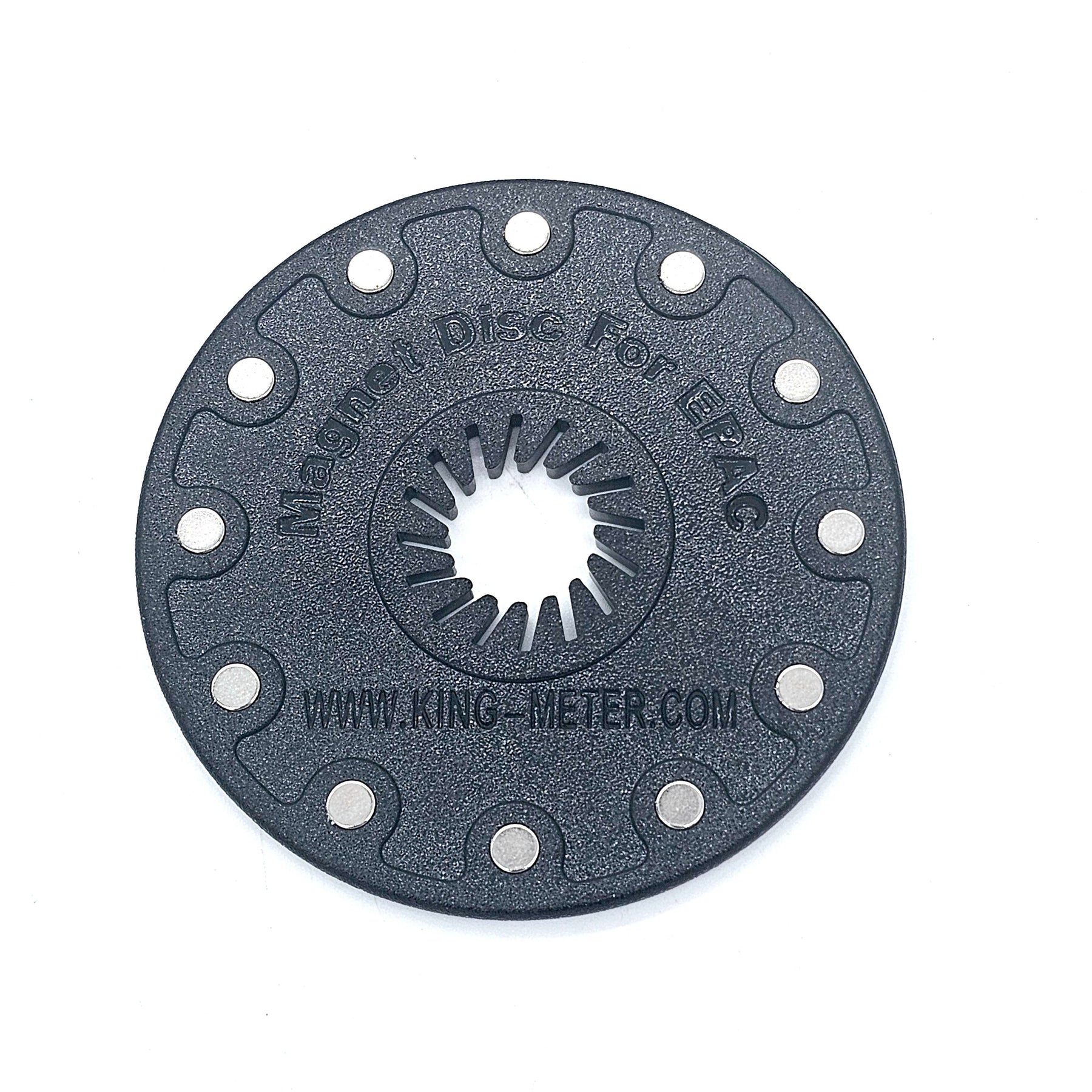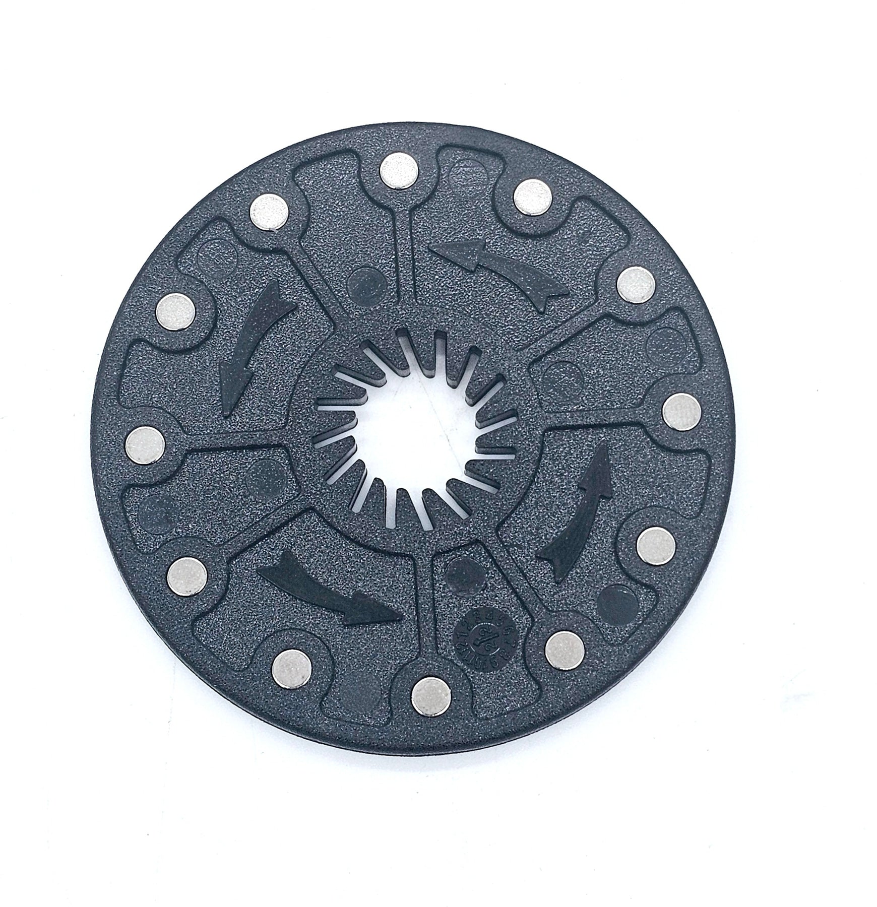 A magnetic disk featuring 12 evenly spaced cylindrical magnets. For use in conjunction with a magnetic cadence sensor on an electric bicycle.
