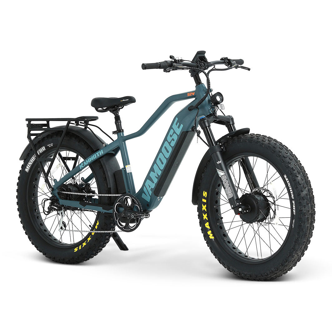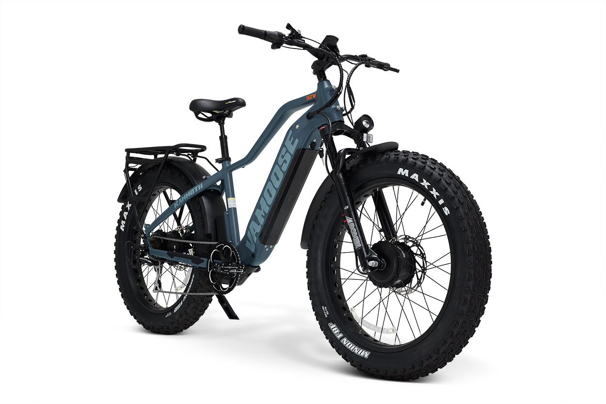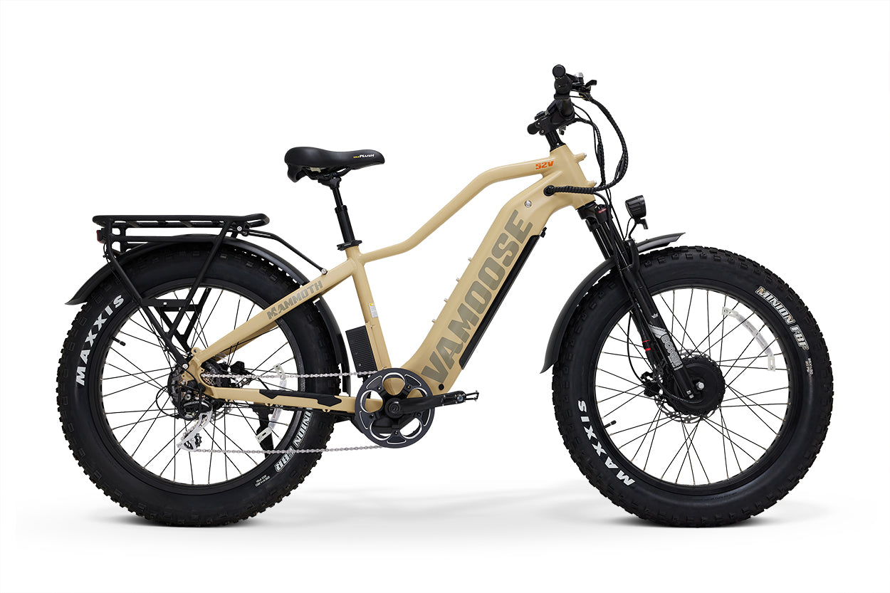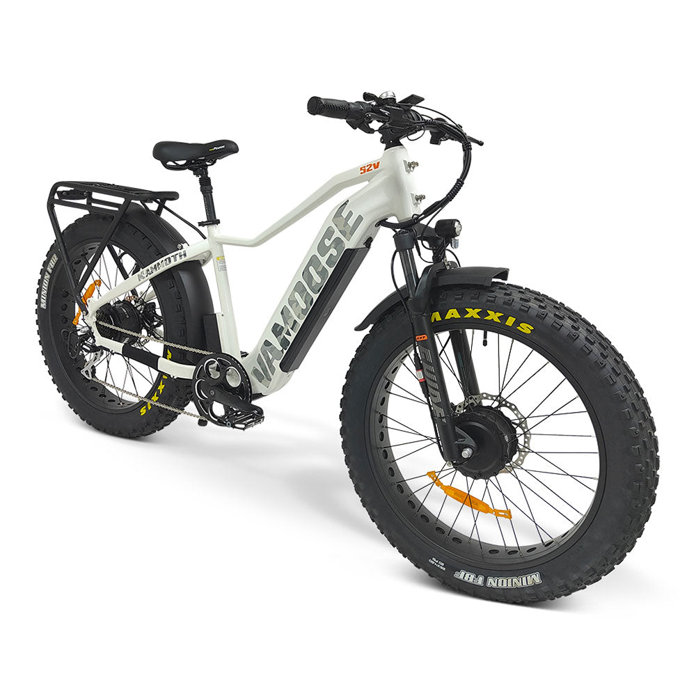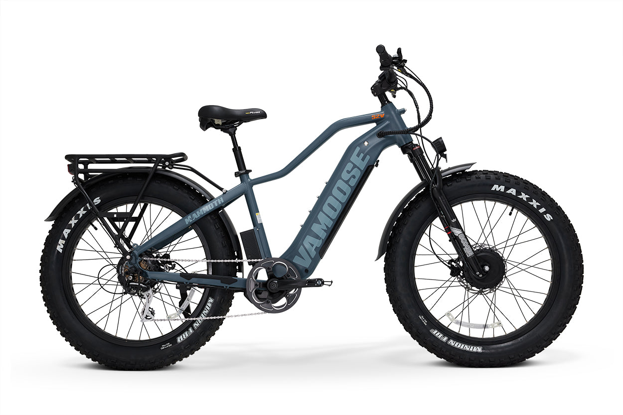 Découvrez le Vamoose Mammoth 500 AWD : deux fois plus de moteurs, deux fois plus de plaisir. Ce véhicule tout-terrain est doté de deux moteurs 52 V 500 W et d'un capteur de couple intelligent pour un contrôle supérieur. Adoucissez les bosses avec des fourches avant à débattement de 120 mm et augmentez la puissance de votre vélo.